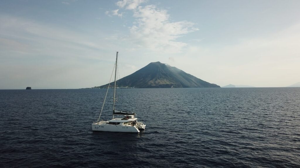 On leaving Buon Dormire in Italy, we had to move South to go round the bottom of Italy and then to Greece. On our way are a number of dormant and active volcanic islands, of course, we decided to visit and anchor at one of the bigger, active volcanoes – Stromboli!